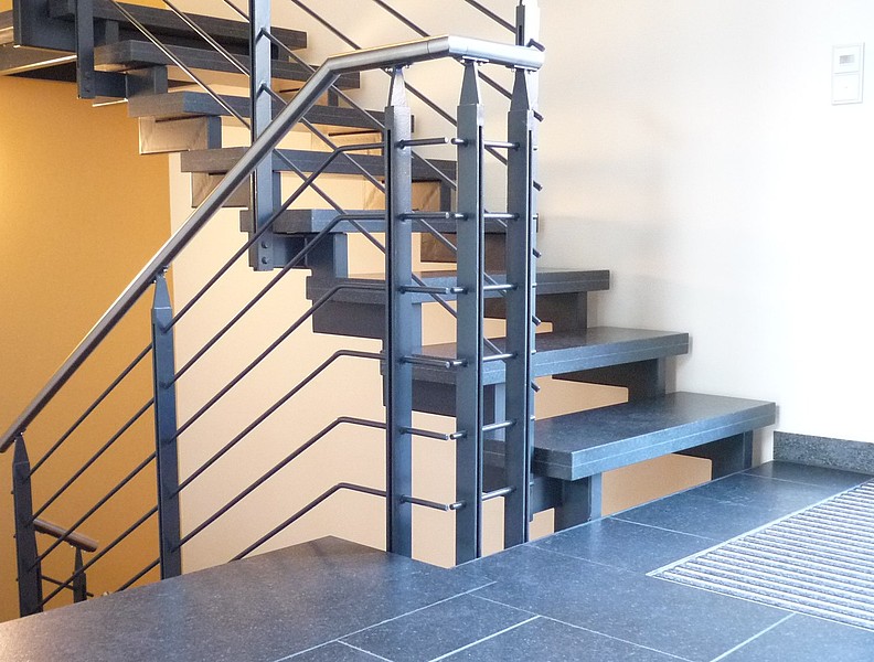 Wir bringen die Natur in Ihr Wohnzimmer, wenn Sie uns lassen… natürlicher geht`s kaum.Im Gespräch mit Bauherren – wenn es um die Gestaltung des Innenbereichs geht – fallen immer die gleichen Argumente. Der Bodenbelag muss schön – dauerhaft – pflegeleicht – etwas besonderes – widerstandsfähig sein. Die natürlichen Eigenschaften, insbesondere bei Allergikern und bei Kindern im Haushalt spielt eine immer größere Rolle. Gepaart mit hervorragenden technischen Eigenschaften insbesondere in der Kombination mit einer Fußbodenheizung kann kaum ein anderer Baustoff mithalten. Hinzukommt die wahnsinnig große Vielfalt verschiedener Materialien, verschiedener Oberflächenbearbeitungen und der Möglichkeit die Größen der Werkstücke an die Gegebenheiten anzupassen. Wir fertigen individuell die Größen und Formate, die nötig und gestalterisch gelungen sind. Großformatige Platten mit durchlaufender Maserung, Kombinationen aus verschiedenen Materialien im Verlegeverband sind für uns kein Problem. Alles aus einem Guß………. Aus einem Steinblock können zum Beispiel die Werkstücke für den Bodenbelag, den Treppenbelag und den Eingangsaußenbereich gefertigt werden. Mit unterschiedlichen Dicken und Oberflächenbearbeitungen sind diese aus einem Stein gefertigt, so dass das harmonische Bild durchgängig vorhanden ist. Treppenanlagen können unterschiedlich aufgebaut sein. Naturstein kann sowohl eine Betonunterkonstruktion verkleiden, sowie auch auf einer Metallkonstruktion aufgebracht werden. Mit unterschiedlichen Möglichkeiten der Oberflächenbearbeitungen kann die Rutschsicherheit beeinflusst werden. Verschiedene Natursteine haben unterschiedliche Eigenschaften. Lassen Sie sich fachkundig beraten, so dass Sie den geeigneten Naturstein für Ihre Anforderungen finden.